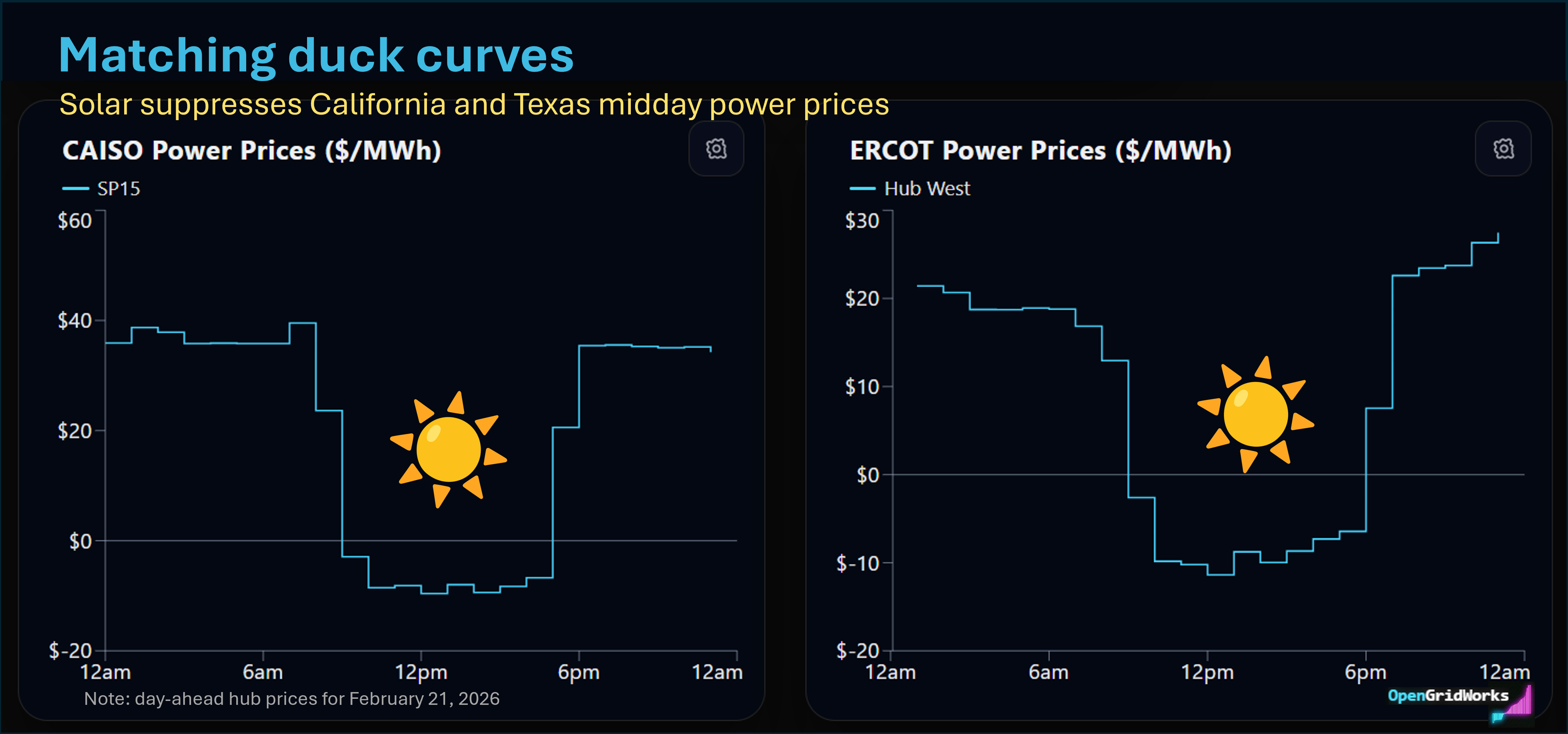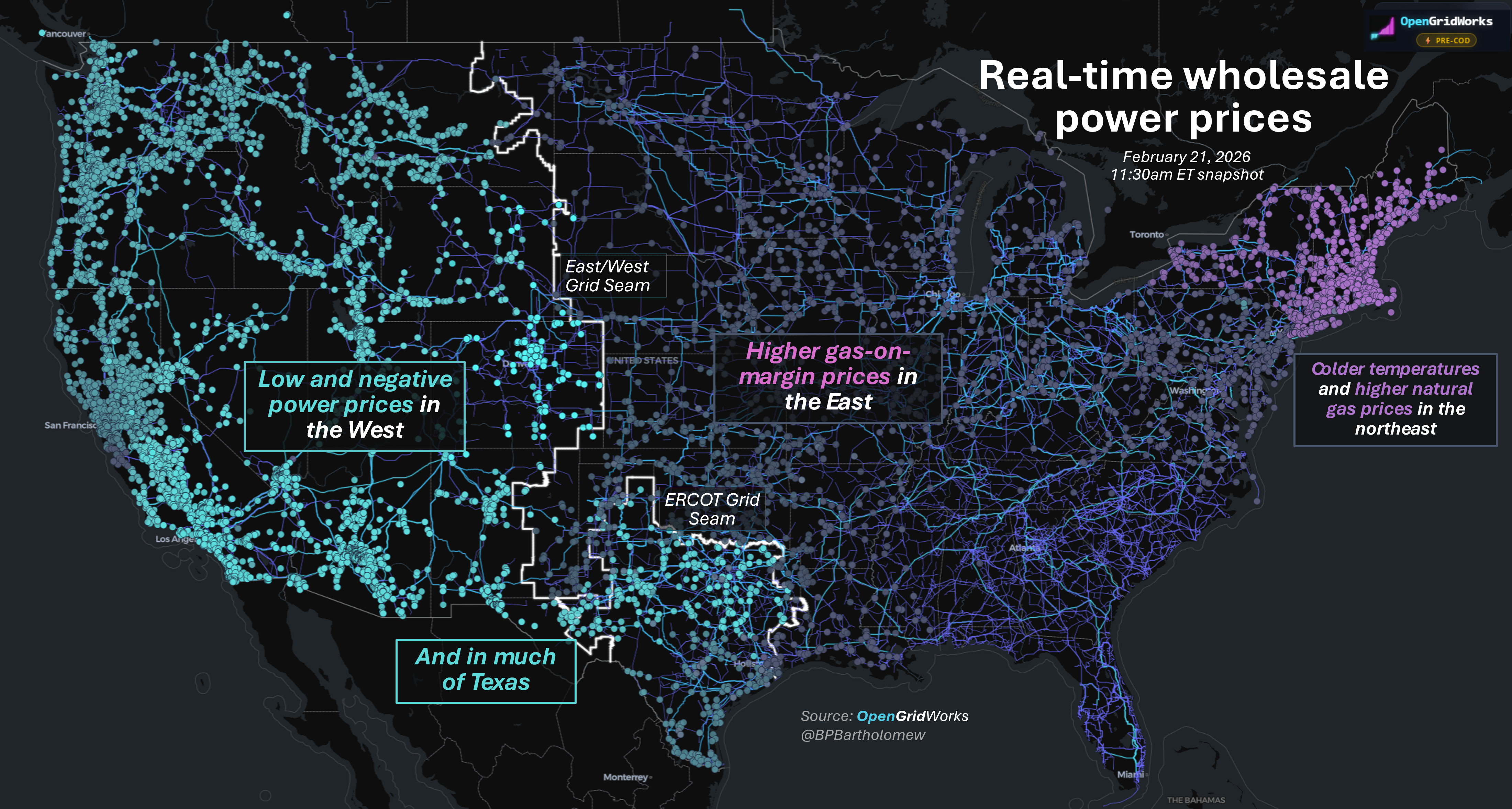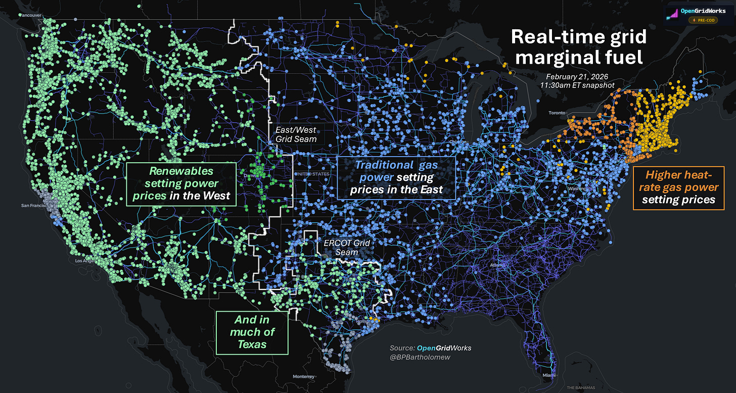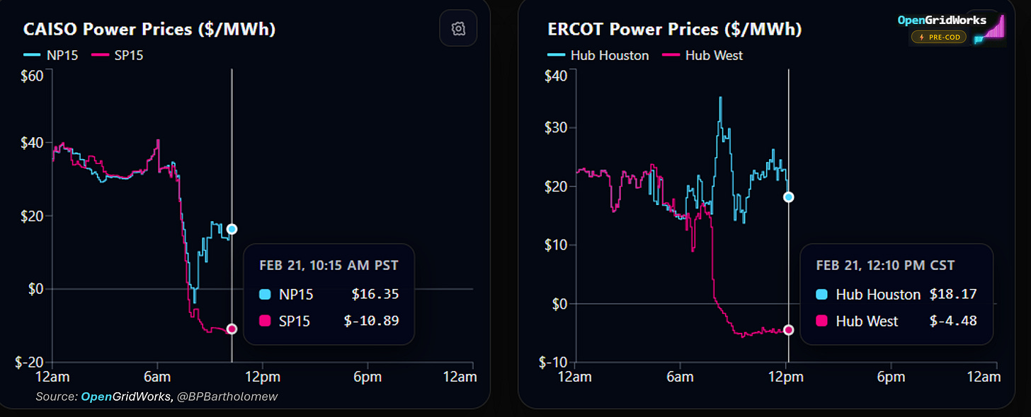 There’s free and negative pricing for wholesale electricity across the west and most of Texas, and higher prices just on the other side in the east.